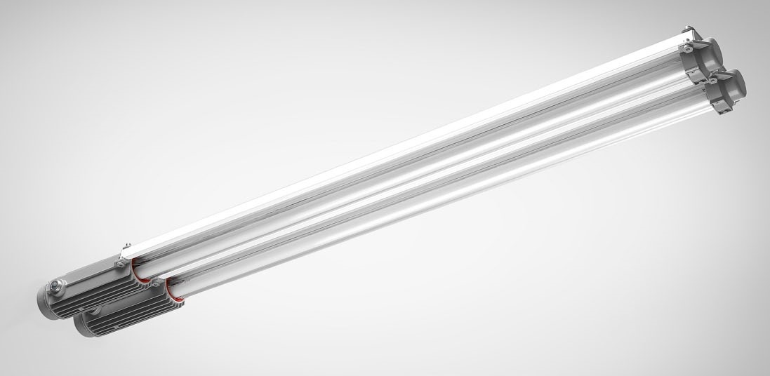 The lighting fixtures in this series come in single or double lamp versions. The double lamp version is made by connecting two single lamps. Each single lamp consists of a protective tube of borosilicate glass with high mechanical strength and high temperature resistance, sealed directly on two heads made of an aluminium alloy with low copper content.