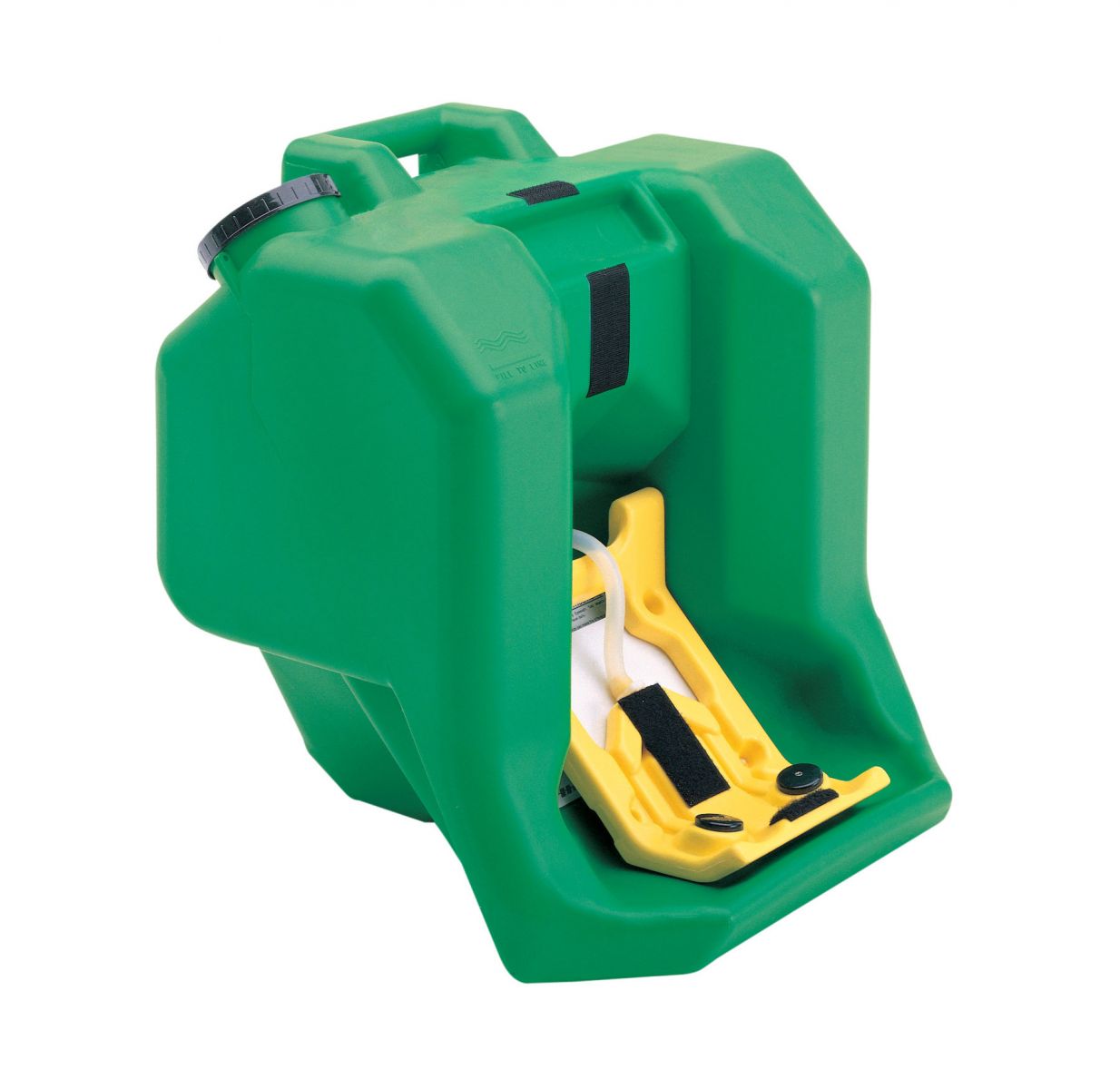 Pulling down the eyewash arm will begin flushing the 16 gallon portable at .4 gpm (1.5 L) during the required 15 minutes, creating a full patterned flushing of the eyes.